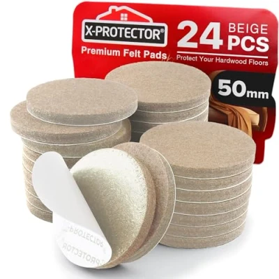 ✌ DOES CHAIR MOVE AND SCRATCH YOUR FLOOR? FORGET ABOUT SCRATCHES! Furniture felt pads X-PROTECTOR – THE BEST FLOOR PROTECTORS for furniture legs, wooden, laminate, or tiled floors! ✌ PERFECT PACK – round 24 pcs beige felt furniture pads X-PROTECTOR Premium Quality 50mm chair leg protectors - THE BEST SIZE to fit the most of your home furniture to prevent scratches. ✌ X-PROTECTOR felt pads for furniture are made of PREMIUM FELT 4mm AND TENACIOUS ADHESIVE! This guaranteed furniture protectors WILL HOLD ON FOR A LONG TIME! ✌ X-PROTECTOR SUITABLE FOR ANY HOME FURNITURE – our felts wood floor protectors for furniture are perfect for any chair legs and furniture feet. STICK IT EASY TO YOUR HOME FURNITURE! ✌ X-PROTECTOR IS A REGISTERED TRADEMARK – AVOID THE COPIES. ORDER IT NOW RISK FREE!