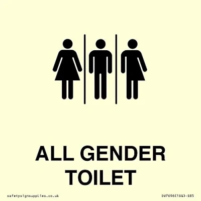 I029 : Female, Male and Non-gender specific This sign is made from vinyl photoluminescent sticker S85 square Sign Text: ALL GENDER TOILET