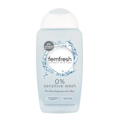 Femfresh 0% Sensitive Intimate Wash Feminine Hygiene Shower & Bath Gel Cleanser pH Balanced, Soap Free, Fragrance Free Vegan Formula w. Purifying Lotus Flower Extract to Soothe Protect 250ml
