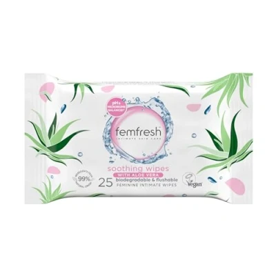 Femfresh Soothing Intimate Wipes, Flushable & Biodegradable Feminine Wipes with Aloe Vera Calendula, pH Balanced Hypoallergenic, 25 Count