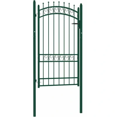 General description This fence gate forms a practical security barrier for your garden, patio, or terrace. Manufactured from heavy-duty steel, it features a sturdy construction and is powder-coated to resist rust and corrosion. The vertical bars are equipped with spikes, and a strong horizontal brace reinforces the gate, providing a high degree of security. The elegant arched top design enhances its aesthetic appeal. Technical specifications Colour: Green Material: Powder-coated steel Overall size: 102 x 225 cm (W x H) Gate panel height: 175 cm Assembly required: Yes SKU: 146376 Installation The gate comes with two solid posts and sturdy hinges for easy installation. Other information