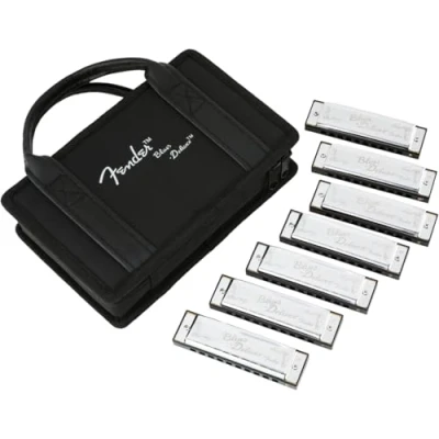 The sampler set of 7 Fender Blues Deluxe Harmonicas is a comprehensive collection for musicians; It includes seven harmonicas in different keys, housed in a case for easy storage and transport, showcasing Fender’s quality craftsmanship This pack of Fender harmonicas offers seven keys for various musical styles; They provide a bright, articulated tone perfect for blues, folk, rock, and more, showcasing Fender’s quality and reliability With chromed metal covers and solid construction, these harmonicas offer durability and longevity; Each harmonica delivers a classic, bright tone thanks to precision engineering and quality materials These harmonicas are a testament to the brand's legacy and come with Fender's 2-year limited warranty; Made with precision, the Fender Blues Deluxe Harmonicas set the standard for quality and craftsmanship, ensuring a lifetime of musical enjoyment