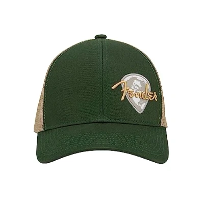 Stylish green khaki cap with off-centered globe pick patch for a unique Fender look One size fits most thanks to an adjustable snapback closure Crafted from 100 percent cotton for comfort and breathability Six panel design with dark green ring spun cotton front and khaki mesh back An ideal gift for musicians, and music fans
