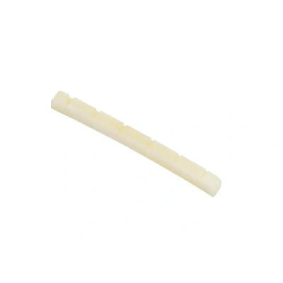 High-quality genuine bone string nut for modern-style electric guitars with a 9.5" fingerboard radius. Pre-slotted with string location grooves to make spacing and positioning a breeze when performing the final string slot filing. Please note: Some filing and shaping modification is required to ensure proper fit and performance. 9.5" (241.45mm) top radius, 7.25" (184mm) bottom radius 1.695" (43.05 mm) wide