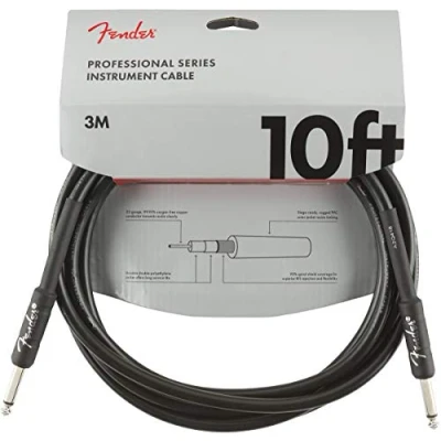 The Fender Professional Series guitar and instrument cable (10ft, 3m) in Black reflects Fender's legacy of excellence, offering top-tier sound quality and performance; Cables can so often lack durability, but Fender's are built to last Perfect for all musicians, this guitar cable ensures exceptional sound clarity with its robust build; The spiral shielding and nickel-plated connectors deliver a loss-free, pure sound With a sleek black design, this cable features 22 AWG wire and nickel-plated connectors for optimal conductivity and minimal noise interference Designed with straight-to-straight connectors, this 10 ft (3m) cable offers flexibility and reliability, making it ideal for both stage and studio use Made in the USA to the highest standards, Fender guarantees this cable to be free from defects in materials and workmanship; Trust in Fender's renowned legacy for consistent, high-quality performance