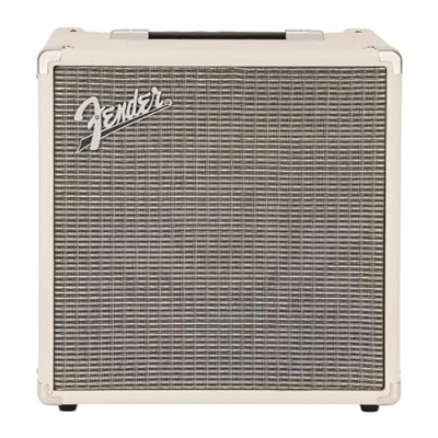Now available in limited edition ivory! The Fender Rumble 25 bass Amp is suitable for electric bass guitars; This compact yet powerful guitar amp includes an 8” Fender special design speaker, delivering classic Fender tone and performance Ideal for beginners and intermediate players, the Fender Rumble 25 amplifier stands out with its sleek black and silver design; The overdrive switch provides a gritty, aggressive tone, setting it apart from other amps in its class The Rumble 25 features a top-mount control panel with ivory “soft touch radio” control knobs for easy adjustments; You can instantly add rich, satisfying overdriven tones to your sound, giving you versatile control over your music Equipped with a 1/8" stereo auxiliary input, this amp allows easy connectivity with digital media players and similar devices; It also includes a headphone output jack for personal listening, ensuring you can practice quietly without disturbing others Weighing just 21 pounds, the Fender Rumble 25 is lightweight and portable, perfect for practice, at-home use and coffeehouse gigs; Trust in Fender's 75-year legacy of quality and craftsmanship