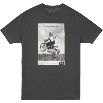 Launched in 1960 Fender's, "You won't part with yours either" campaign was aimed at guitar players who cherish their Fender guitars, and the deep emotional connection that musicians often develop with their instruments. Be a part of our history while wearing your vintage black t-shirt with motorcycle rider graphic from this iconic vintage ad. Now you are ready to Hit the Open Road!! 100% heavyweight cotton tee Garment dyed vintage black