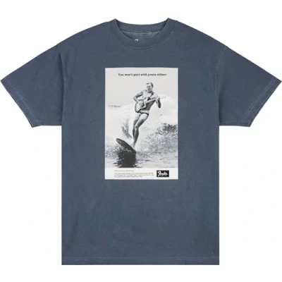 Launched in 1960 Fender's, "You won't part with yours either" campaign was aimed at guitar players who cherish their Fender guitars, and the deep emotional connection that musicians often develop with their instruments. Be a part of our history while wearing your ocean blue t-shirt with surfer graphic from this iconic vintage ad. Surfs Up!! 100% heavyweight cotton tee Garment dyed vintage blue Surfer graphic from 1960 vintage ad campagin, "You won't part with yours either"