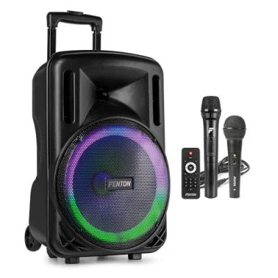 Fenton FT12LED MK2 12" Portable PA System with Wireless Mic, Battery Powered Speaker, Bluetooth, LED Lights, Wired MP3 Player, Rechargeable, Speaker Microphone