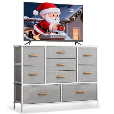 Feonase 9 Drawers Dresser for Bedroom,Wide Fabric with Thickened Metal Frame Storage and Organization,Dresser TV Stand,Chest of Wood Top Living Room, Hallway (Light Grey)