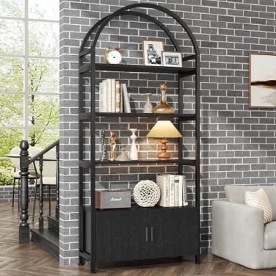 【Elegant Design】The rustic and black arched design adds a classic, stylish touch to your home décor, making this bookshelf a standout furniture piece. 【Ample Display and Storage】With four open shelves and one hidden storage cabinet, this bookcase offers flexible options for showing off and organising your belongings. 【Versatile Organiser】Ideal for the office, living room, bedroom, or cloakroom, this unit can serve as a file cabinet, display shelf, or decorative storage. 【Durable Construction】Featuring a steel frame and E1 melamine boards, this bookshelf is built to last, easy to clean, and scratch-resistant. 【Easy Assembly and Support】Numbered parts and step-by-step instructions make setup simple. Video guides are available, and our 24-hour customer service is always on hand to assist.
