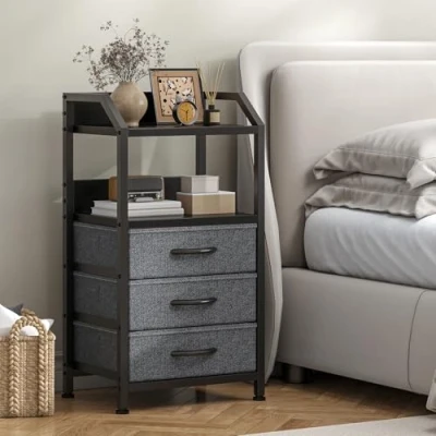 Feonase Bedside Table with 3 Fabric Drawers and Open Shelf, Nightstand for Bedroom, Living Room, Small Spaces Metal Frame & Wooden Top, Compact Sofa End Storage Home Décor, Deep Grey