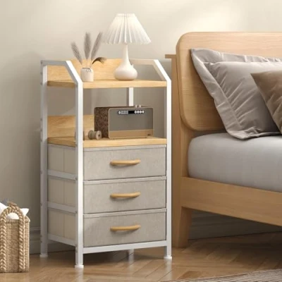 Feonase Bedside Table with 3 Fabric Drawers and Open Shelf, Nightstand for Bedroom, Living Room, Small Spaces Metal Frame & Wooden Top, Compact Sofa End Storage Home Décor, Khaki
