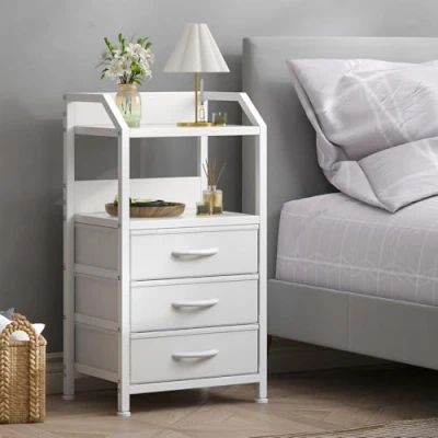 Feonase Bedside Table with 3 Fabric Drawers and Open Shelf, Nightstand for Bedroom, Living Room, Small Spaces Metal Frame & Wooden Top, Compact Sofa End Storage Home Décor, White
