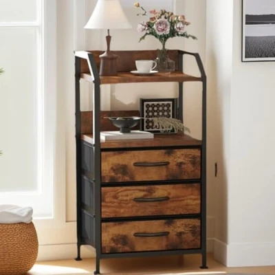Feonase Bedside Table with 3 Fabric Drawers and Open Shelf,Side Wood Top Metal Frame,Modern Nightstand End Table,Small for Bedroom、Living Room Small Spaces (Rustic Brown)