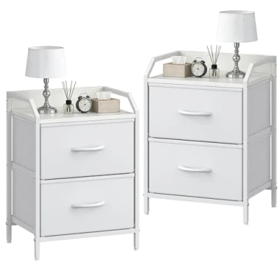 【2 Fabric Drawers】This white Bedside Tables Set features 2 removable Fabric storage drawers that keep your bedtime essentials, books, electronics, or clothes neatly organized and within easy reach. It's perfectly sized for cozy bedrooms, dorms, and apartments. 【Sturdy Metal Frame】This side table built with a rock-solid Metal frame supports up to 20KG. Four self-levelling feet keep it steady on carpets or uneven floors, while guarding your floors against scratches. 【Wooden Top & Fabric Drawers】Enjoy a wooden MDF top that's both stylish and spill-proof for quick cleanups; the sturdy fabric drawers keep their shape and glide smoothly for a pure pleasure every time. 【Multi-purpose Use】Functions perfectly as a bedside cabinet, small dresser, side table living room, or storage organizer, seamlessly fitting your bedroom, living room, office, entryway, or kids' room. 【Quick-Assembly】The package will come with all the tools and accessories for quick assembly, which allows only about 15 minutes to assemble your bed side table for bedroom organizer with detailed instructions and the installation video.