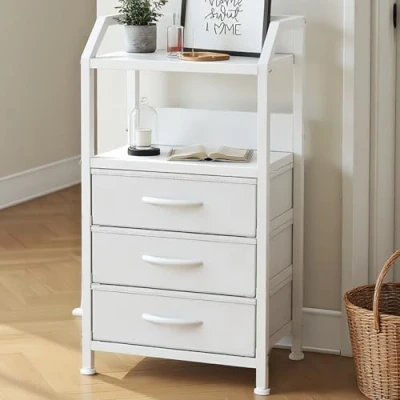 Feonase Chest of Drawers, 3 Fabric Drawers Storage Unit with Open Cubby, Steel, MDF, Non Woven Fabric, Side Table Wood Top, for Bedroom, Closet, Hallway, Living Room (White, Single)