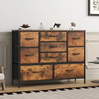 Feonase Chest of Drawers,Bedroom Dresser with 9 Fabric Drawers, Metal Frame & MDF Wood Top, Adjustable Feet, Storage Organizer Unit for Bedroom, Closet, Living Room, Office Hallway, Rustic Brown
