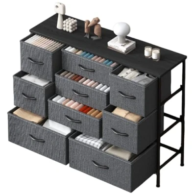 Feonase Chest of Drawers, Bedroom Dresser with 9 Fabric Metal Frame & MDF Wood Top, Adjustable Feet, Storage Organizer Unit for Bedroom, Closet, Living Room, Hallway, Deep Grey