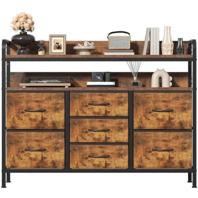 【Large-Capacity Layered Storage】This chest of drawers is equipped with 7 fabric drawers and 2 spacious shelves, creating a three-dimensional storage space. The drawers allow for organized storage of clothing, miscellaneous items, and other scattered belongings, while the flat top surface serves both as a display area and a functional space for placing table lamps, photo frames, and decorative items. It effectively solves the problems of disorganization and cluttered storage. 【Sturdy and Safe Materials】The chest of drawers bedroom features soft, breathable fabric drawers that prevent clothes from getting scratched. Combined with a sturdy steel frame and a wooden top surface, it offers a solid structure with stable weight-bearing capacity. The adjustable feet allow it to adapt to slightly uneven floors. Whether used for heavy items or in households with children, it ensures reliable stability and safety, balancing practicality and care. 【Versatile and Flexible Application】 With its simple design that suits any style, this storage cabinet can be flexibly used in various spaces—storing clothes in the bedroom or dressing room, displaying plants and decorations in the living room, organizing stationery and documents in the study, or serving as an entryway console or hallway storage cabinet." 【Simple and Stylish Design】Designed in a minimalist modern style, this cabinet easily complements a variety of home decor aesthetics. The raised back guardrail on the top prevents items from falling and also functions as a carrying handle, adding practical detail. Its compact size saves space and allows it to blend seamlessly into any room. 【Easy Self-Assembly】The package includes detailed illustrated assembly instructions, with all parts clearly marked with letters and numbers for easy identification. The steps are simple and easy to follow, allowing one person to complete the assembly independently. Should you encounter any issues, please feel free to contact us—we are committed to providing a satisfactory solution within 24 hours.