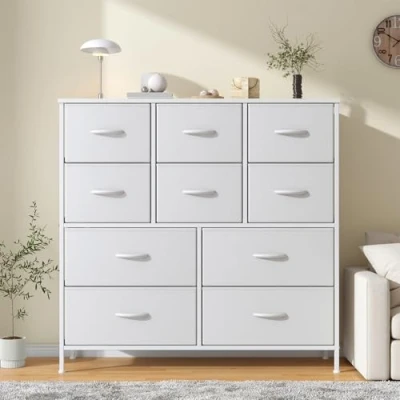 Feonase Chest of Drawers,Bedroom Tall Dresser with 10 Fabric Drawers, Metal Frame & MDF Wood Top, Adjustable Feet, Storage Organizer Unit for Bedroom, Closet, Living Room, Office Hallway, White