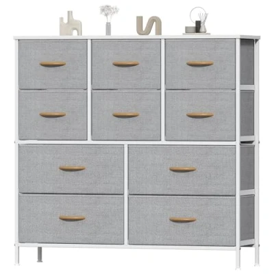 Sturdy Construction – Built with a strong metal frame and durable MDF wood top; this chest of drawers includes 10 removable foldable drawers with easy-pull handles and 4 adjustable feet that protect floors from scratches. Durable Fabric – Drawers are made of breathable, high-quality non-woven fabric; easy to maintain—just wipe with a damp cloth and air dry; ideal for a large chest of drawers that offers ample storage for clothes, bedding, or household essentials. Easy Assembly – Comes with clear instructions, installation video, and all necessary hardware; quick setup with only a few screws required; perfect choice for a bedroom chest of drawers or apartment storage. Multiple Color Options – Available in 5 stylish colors: Dark Gray, Khaki, Light Gray, White, and Rustic Brown; blends with any décor style, whether you need a white chest of drawers for modern rooms or rustic tones for cozy spaces. Large Storage Capacity – This large chest of drawers features 10 spacious drawers (4 large + 6 medium) to neatly organize clothes, socks, underwear. Overall size: 39.4"L x 11.8"W x 38.2"H, perfect for small spaces while offering ample storage.