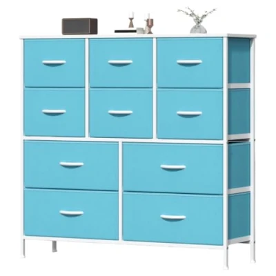Feonase Chest of Drawers, Bedroom Tall Dresser with 10 Fabric Metal Frame & MDF Wood Top, Adjustable Feet, Storage Organizer Unit for Bedroom, Closet, Living Room, Hallway Rustic Blue