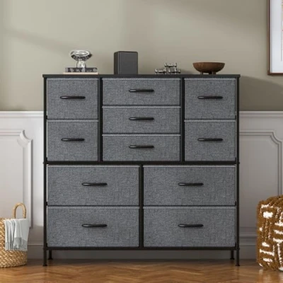 Sturdy Construction – Built with a strong metal frame and durable MDF wood top; this chest of drawers includes 11 removable foldable drawers with easy-pull handles and 4 adjustable feet that protect floors from scratches. Durable Fabric – Drawers are made of breathable, high-quality non-woven fabric; easy to maintain—just wipe with a damp cloth and air dry; ideal for a large chest of drawers that offers ample storage for clothes, bedding, or household essentials. Easy Assembly – Comes with clear instructions, installation video, and all necessary hardware; quick setup with only a few screws required; perfect choice for a bedroom chest of drawers or apartment storage. Multiple Color Options – Available in 5 stylish colors: Dark Gray, Khaki, Light Gray, White, and Rustic Brown; blends with any décor style, whether you need a white chest of drawers for modern rooms or rustic tones for cozy spaces. Large Storage Capacity – This large chest of drawers features 11 spacious drawers (4 large + 4 medium + 3small) to neatly organize clothes, socks, underwear. Overall size: 39.4"L x 11.8"W x 38.2"H, perfect for small spaces while offering ample storage.