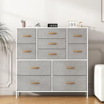 Sturdy Construction – Built with a strong metal frame and durable MDF wood top; this chest of drawers includes 11 removable foldable drawers with easy-pull handles and 4 adjustable feet that protect floors from scratches. Durable Fabric – Drawers are made of breathable, high-quality non-woven fabric; easy to maintain—just wipe with a damp cloth and air dry; ideal for a large chest of drawers that offers ample storage for clothes, bedding, or household essentials. Easy Assembly – Comes with clear instructions, installation video, and all necessary hardware; quick setup with only a few screws required; perfect choice for a bedroom chest of drawers or apartment storage. Multiple Color Options – Available in 5 stylish colors: Dark Gray, Khaki, Light Gray, White, and Rustic Brown; blends with any décor style, whether you need a white chest of drawers for modern rooms or rustic tones for cozy spaces. Large Storage Capacity – This large chest of drawers features 11 spacious drawers (4 large + 4 medium + 3small) to neatly organize clothes, socks, underwear. Overall size: 39.4"L x 11.8"W x 38.2"H, perfect for small spaces while offering ample storage.