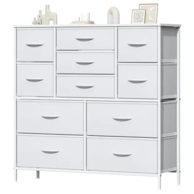 Feonase Chest of Drawers, Bedroom Tall Dresser with 11 Fabric Metal Frame & MDF Wood Top, Adjustable Feet, Storage Organizer Unit for Bedroom, Closet, Living Room, Hallway, White