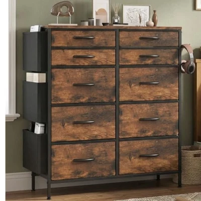 Feonase Chest of Drawers Bedroom, Tall Fabric Dresser with 10 Drawers, 3 Side Pockets & 2 Hooks, Metal Frame, Wood Top, Storage Organizer for Living Room, Hallway, Closet (Rustic Brown)