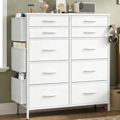 Feonase Chest of Drawers Bedroom, Tall Fabric Dresser with 10 Drawers, 3 Side Pockets & 2 Hooks, Metal Frame, Wood Top, Storage Organizer for Living Room, Hallway, Closet (White)