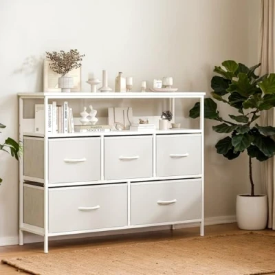 Spacious & Organized Chest of Drawers Storage Solution:This fabric drawers dresser provides ample, hidden storage to keep your belongings neatly organized. Its five deep drawers let you categorize clothing, accessories, linens, blankets or children's toys effortlessly, while each removable fabric drawer boasts generous capacity in a slim, space-saving profile that fits perfectly in small bedrooms, hallways, nurseries, or dressing rooms. The smooth top surface also serves as an ideal spot for displaying lamps, clocks and daily necessities, blending practicality with versatile functionality for any living space. Space-Saving Storage & Display:This narrow fabric chest of drawers features a compact 30cm depth, fitting seamlessly into tight spaces while delivering ample storage. Smooth ergonomic handles enable easy drawer access, keeping your home neat without hogging floor room. Its double-shelf top offers extra surface for plants, books, lamps, photo frames or decor, doubles as a TV unit or bedside cabinet, and supports up to 20kg for reliable daily use. Durable & Safe Bedroom Storage Unit:Built with a reinforced metal frame and water-resistant laminated MDF top, this bedroom storage unit guarantees long-lasting stability for daily use. Sturdy steel crossbars prevent drawer sagging over time, while adjustable feet ensure balance on uneven floors and an included anti-tip kit eliminates accidents, keeping your family safe. Versatile & Multifunctional bedroom drawers:This modern bedroom furniture set serves as a stylish, functional storage solution that effortlessly blends into diverse spaces—including closets, hallways, living rooms, bedrooms, offices, nurseries and entryways. It even doubles as a handy TV stand with storage drawers, maximizing utility for any home area. Effortless Quick Assembly:This storage unit comes with clear step-by-step instructions and clearly labelled components, enabling a fast, hassle-free setup in roughly 25 minutes. It also includes non-slip floor protectors that prevent scratches on hard flooring and boost overall stability, making it perfect for bedrooms, living rooms, hallways or rented flats.