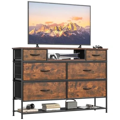 Feonase Chest of Drawers for Bedroom with Shoes Shelf, 47.2Wide Fabric Dresser 6 Drawers, TV Stand Open Storage Multi function Cabinet Bedroom, Living room, Brown