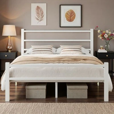 【Strudy & Durable】Constructed with heavy-duty premium-grade materials, Double metal beds ensure a restful sleep night after night. 13 metal bars and 6 metal legs provide a high load capacity of up to 600lb, offering sufficient firmness and support. 【Classic & Elegant】Bed frames feature classically elegant, artistically designed headboard and footboard. Its simple lines and thick, textured material allow them to blend seamlessly with various room styles, offering versatile appeal. 【Ample Under-Bed Storage】With 30cm high clearance underneath, this bed frame double provides generous space for storage boxes and bins, offering a practical solution to maximize space in bedrooms or small apartments. 【Clever Design】 This bed frame double bed securely anchors your mattress with a snug, embedded design, ensuring it stays perfectly in place. The EVA foam construction guarantees silent, creak-free support for peaceful repose. And for added safety in the dark, integrated glow-in-the-dark strips on the legs emit a soft light to guide your way and prevent stubbed toes. 【30 Minute Assembly】 Everything you need arrives in one box. Our innovative insert-and-lock design for the metal slats gets your bed frame ready in under half an hour—guaranteed.