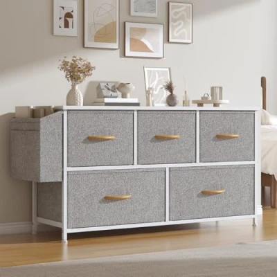 Feonase Fabric 5 Drawer Storage Cabinet with Side Pocket Wide Dresser Chest for Bedroom, Hallway, Nursery & Closet, Metal Frame Wood Top, Lightweight Unit Light Grey