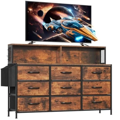 Feonase Large Chest of Drawers Bedroom, 9 Dresser with Shelf and Side Pocket, Metal Frame, MDF Top Board, Versatile Organizer Storage Unit for Living Room, Rustic Brown