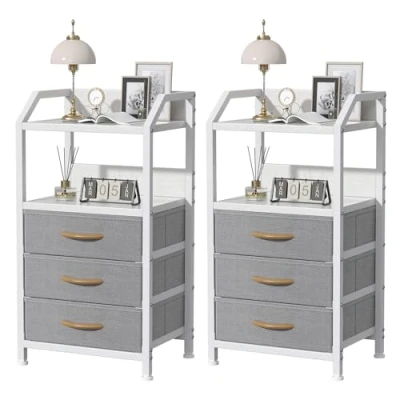 Feonase Set of 2 Bedside Table with 3 Fabric Drawers & Shelf, Nightstand for Bedroom, Living Room, Small Spaces Metal Frame Wooden Top, Sofa End Storage Home Décor, Light Grey