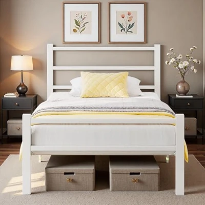 【Strudy & Durable】Constructed with heavy-duty premium-grade materials, Single metal beds ensure a restful sleep night after night. 13 metal bars and 6 metal legs provide a high load capacity of up to 600lb, offering sufficient firmness and support. 【Classic & Elegant】Bed frames feature classically elegant, artistically designed headboard and footboard. Its simple lines and thick, textured material allow them to blend seamlessly with various room styles, offering versatile appeal. 【Ample Under-Bed Storage】With 30cm high clearance underneath, this bed frame single provides generous space for storage boxes and bins, offering a practical solution to maximize space in bedrooms or small apartments. 【Clever Design】 This metal bed frame single securely anchors your mattress with a snug, embedded design, ensuring it stays perfectly in place. And for added safety in the dark, integrated glow-in-the-dark strips on the legs emit a soft light to guide your way and prevent stubbed toes. 【30 Minute Assembly】 Everything you need arrives in one box. Our innovative insert-and-lock design for the metal slats gets your bed frame ready in under half an hour—guaranteed.