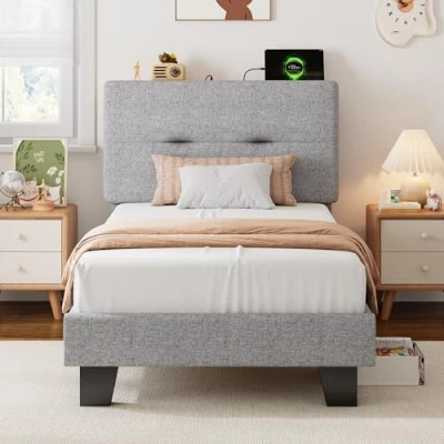 Storage Headboard with Charging Station: Bed frame Single features a built-in charging hub with 2 AC sockets and 2 USB ports, keeping your phone, tablet, and other devices fully powered and within arm's reach. Additionally, storage shelf behind the headboard provides easy access to essential items, with no need to worry about them falling on you. Soft Upholstered bed frames: Crafted with a modern aesthetic, this single Upholstered bed headboard features premium soft linen and impeccable stitching. Its built-in high-resilience memory foam ensures superior comfort, while its stylish design acts as a functional art piece that complements any bedroom style and adds a contemporary warmth. Exceptional Durability: Crafted from a robust iron frame and reinforced wooden slats, this platform bed frame supports up to 660lbs, without needing a box spring, ensuring reliable stability and long-lasting performance Designed for Peace of Mind: Cocooned in thickened linen upholstery, this kids bed frame offers 360° protective cushioning to prevent bumps and bruises against sharp corners. The low-profile, 11cm height ensures safe climbing for little ones and provides a secure。 Easy Installation: All necessary items well packaged in one box; includes clearly instructions, needed tools, and numbered parts,can be installed in 45 mins.Our single bed frame with headboard No Box Spring Needed,Designed simple assembly; mattress does not slide.