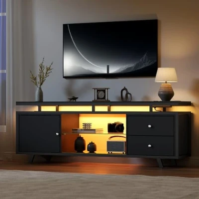 【Excellent Storage Solution】This TV stand features 1 cabinet and 2 drawers, offering ample storage for electronics, books, cameras, and daily essentials. Its middle section is equipped with adjustable glass shelves, allowing customized storage based on your needs. The extra top space of the cabinets provides additional stowage room. This smart layout keeps your space tidy while seamlessly blending practicality with modern aesthetics. 【RGB LED Lighting System】Equipped with RGB LED lights, this entertainment center offers 7 vivid colors and 22 dynamic modes, controllable via APP or touch button for instant adjustments. Effortlessly transform your living room/bedroom into a lively party space or immersive gaming hub with one click, elevating your home entertainment atmosphere. 【Built-in Charging Station】The media console comes with an integrated charging station, including 2 AC outlets, 1 USB port, and 1 Type-C port. It caters to the power needs of TVs, DVD players, smartphones, game consoles, and more, enabling simultaneous charging for all your devices with zero hassle. 【Sturdy & Durable Construction】Crafted from certified high-grade wood, this TV stand boasts exceptional durability for daily use. Its thickened, stable tabletop easily supports 65-inch TVs, gaming consoles, and decor without warping or shaking. Premium tempered glass shelves add style and sturdiness, securing your items while enhancing the cabinet’s sleek look. 【Easy Assembly & Reliable Service】All parts, hardware, and numbered instructions are included, with detailed step-by-step guides for hassle-free assembly. Due to its size and weight, we recommend two people for assembly. We offer 24-hour after-sales service—contact us anytime for product issues, and we’ll resolve them promptly. 【Perfect Size for 65-Inch TVs】Dimensions: 144CM*34CM*H51CM, designed to perfectly fit and support up to 65-inch TVs, ideal for living rooms and bedrooms.