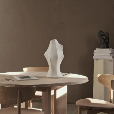 Dae Table Lamp White is a beautifully shaped lamp characterised by a delicate and organic grace that elevates functional design into a beautiful work of art. The lamp is inspired by the Pieridae butterfly chrysalis, as seen in the monochrome white colour shading and thin but strong lampshade of non-woven polymer and unique organic shape, characterised by a carefully conceived and well-executed asymmetry to create a captivating design object. The polymer shade is stretched over an iron frame and has a beautiful transparency that allows light to effortlessly penetrate in all directions in a warm and soft glow that creates a cosy atmosphere. As the light only shines indirectly to the surroundings, you are guaranteed a pleasant and glare-free light to beautifully complement the basic lighting in the room.
