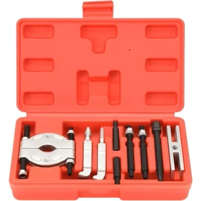 Professional Bearing Separator Puller: High-quality 9pcs bearing puller set designed for precise removal of bearings, pulleys, gears, and bushings. Essential for mechanics and DIY enthusiasts in automotive and industrial applications. Heavy-Duty Alloy Steel Construction: Made from durable alloy steel with heat-treated chrome alloy jaws, this bearing separator kit resists corrosion and ensures long-lasting performance in demanding tasks. Comprehensive 9-Piece Kit: Includes 1 separator, 2 jaws, 1 thrust screw, 2 extension rods, 2 extensions, and 1 crossbeam – everything needed for front and rear wheel hubs, pinions, and axle drive shafts. Versatile & Multi-Functional: Suitable for a wide range of automotive and mechanical repair projects. Can be used independently or combined with other tools for gearboxes, engines, and industrial machinery. Convenient Storage & Transport: Comes with a sturdy ABS plastic case for organized storage and safe portability. Ideal for professional workshops, garages, and DIY users looking for a reliable bearing separator puller set.