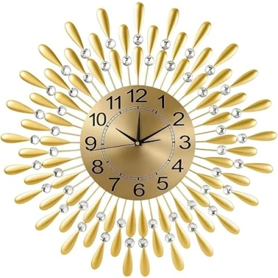 [Modern Design & Large Size]This large modern wall clock features a stunning retro sunflower design, adding a touch of elegance to your living room. With its flash diamond spiked beaded accents, it’s the perfect statement piece for any modern home décor. [Silent Quartz Movement]Enjoy a peaceful environment with the silent quartz movement, providing precise timekeeping without any ticking noise. Ideal for your living room, bedroom, or office, ensuring a quiet, comfortable atmosphere. [Durable & Easy to Install]Crafted from high-quality iron art and glass with a high-temperature baked varnish process, this wall clock resists fading and deformation. Easy to install with a non-marking wall hook that won't damage your walls—just insert 1 AA battery (not included) for hassle-free operation. [Stylish & Functional]The large, easy-to-read numerals on the dial enhance both functionality and style. Whether it’s for your living room or kitchen, this modern wall clock combines practical use with artistic design. [Perfect Home Décor & Gift Idea]This large decorative wall clock is more than just a timepiece; it's an eye-catching accent that elevates the ambiance of any room. A great choice for housewarmings, birthdays, or holiday gifts, making it a thoughtful present for loved ones.