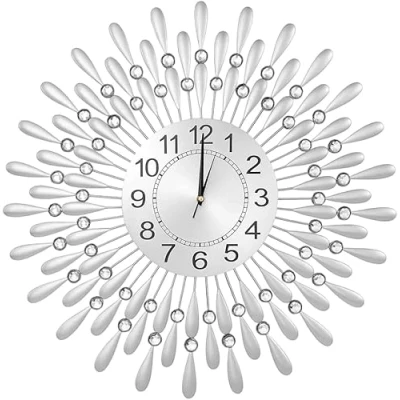 [Modern Design & Large Size]This large modern wall clock features a stunning retro sunflower design, adding a touch of elegance to your living room. With its flash diamond spiked beaded accents, it’s the perfect statement piece for any modern home décor. [Silent Quartz Movement]Enjoy a peaceful environment with the silent quartz movement, providing precise timekeeping without any ticking noise. Ideal for your living room, bedroom, or office, ensuring a quiet, comfortable atmosphere. [Durable & Easy to Install]Crafted from high-quality iron art and glass with a high-temperature baked varnish process, this wall clock resists fading and deformation. Easy to install with a non-marking wall hook that won't damage your walls—just insert 1 AA battery (not included) for hassle-free operation. [Stylish & Functional]The large, easy-to-read numerals on the dial enhance both functionality and style. Whether it’s for your living room or kitchen, this modern wall clock combines practical use with artistic design. [Perfect Home Décor & Gift Idea]This large decorative wall clock is more than just a timepiece; it's an eye-catching accent that elevates the ambiance of any room. A great choice for housewarmings, birthdays, or holiday gifts, making it a thoughtful present for loved ones.