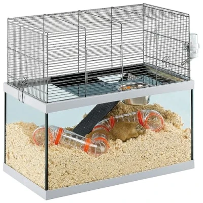 IDEAL HABITAT: Cage for rodents, on two floors. The rounded roof opens and locks with locking clips. The space between the bars of 7.3 mm makes it suitable for: Gerbils, Hamsters. PRACTICAL AND FUNCTIONAL: The glass case is designed to be filled with sawdust, allowing hamsters and gerbils to dig and hide. The network is equipped with doors that can be opened from the outside, equipped with a safety locking system. Habitat developed on 2 floors, connected by an iron ladder-plan, for greater freedom of movement for your pet. The feeder and drinker are included. ITALIAN DESIGN: Ferplast is an Italian company and this Cage was designed entirely in Italy with the utmost care and attention to detail that distinguishes Made in Italy. ACCESSORIES INCLUDED: 1 feeder, 1 drinker, 1 nest-house, 1 wheel, 2 shelves and 2 ladders guarantee one or more specimens a constant supply of food and water, but also the necessary for fun and rest. OVERALL DIMENSIONS: External space: 60x31,5xh52 cm; SPACE BETWEEN BARS: 7.3mm. BAR DIAMETER: 1.5-3 mm.