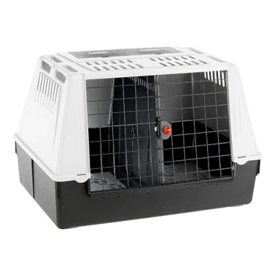 Dog carrier designed to be placed in the boot of most cars. Made of resistant thermoplastic resin. Plastic-coated steel door that slides both to the right and to the left, with safety closing system Very easy to handle thanks to the handles on the sides. Large ventilation grids for a well-aerated environment Useful storage compartment for the necessary accessories. Draining pad included Model recommended for a large dog or two medium-small dogs. Overall dimensions: 100 x 60 x h 66 cm. Maximum capacity: 40 kg.