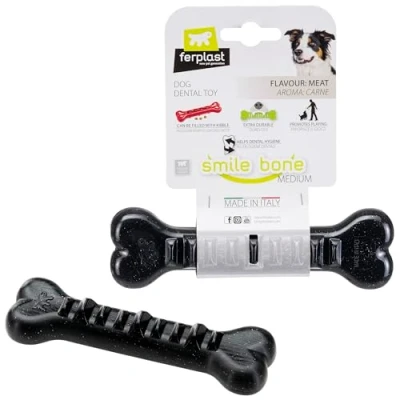 Ferplast Dog Toy, Treat Dispenser Bone, Chew Made of Durable Material, Meat Flavoured, for Dental Hygiene, SMILE Medium Size Toys, Black