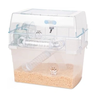 MULTI-LEVEL FUN: Offers two spacious floors connected by ladder and tunnel, providing a diverse and stimulating environment for small rodents, with space for digging and exploring. EASY VIEWING: The clear plastic bottom provides an unobstructed view of your pet's activities, enhancing interaction without disturbing them. ITALIAN DESIGN AND HERITAGE: Designed by Ferplast in Italy, a pioneer in pet care innovation since 1966, known for habitats that blend functionality with aesthetic appeal, enhancing the quality of life for pets worldwide. ACCESSORIES INCLUDED: feeder, drinking bottle, nest for rodents, transparent plastic shelf, ladder and exercise wheel for exercise, set of tubes. OVERALL DIMENSIONS: 57,5 x 47,5 x h 54,5 cm.