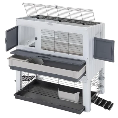 SPACIOUS 2 FLOORS: 2-storey indoor hutch, cage for rabbits and guinea pigs, complete with pen on the ground floor and upper floor with rabbit house. Plenty of room for your pet's daily activities GROUND FLOOR: wire mesh rabbit enclosure with ramp doors that allow your pet to enter and exit independently. Includes rabbit water bottle, hay feeder and ladder to access first floor FIRST FLOOR: rabbit house equipped with a ramp to reach the upper terrace, where the food bowl and the door for quick inspection are located. Large removable tray, which can be filled with litter and equipped with a safety lock EASY MAINTENANCE: opening mesh roof, removable trays, doors with secure closures The rabbit hutch is made of sturdy recycled plastic, to protect the environment in which we live together with our animal friends DIMENSIONS: overall external dimensions of the cage: 108 x 64 x h 113 cm. Internal dimensions of the hutch: 107 x 63 cm. Complete with leaflet with assembly instructions